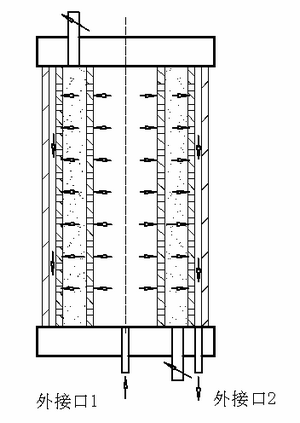 其中:高壓柱筒是徑向高壓圓筒柱的關(guān)鍵部件。它包括由兩個(gè)316L材質(zhì)的柱筒內壁管和柱筒外壁管套裝形成的圓筒柱主體部分,和篩板、配流板等重要輔助零件。在柱筒的內、外壁管上鑲嵌有微孔篩板,其孔徑小于柱內填料直徑。同時(shí),在柱筒的內、外壁管上設計有強制約束液體流向和流量的配流板,以保證流入高壓柱筒的液流在圓筒展開(kāi)面上的每一個(gè)微分面積上流量相等。